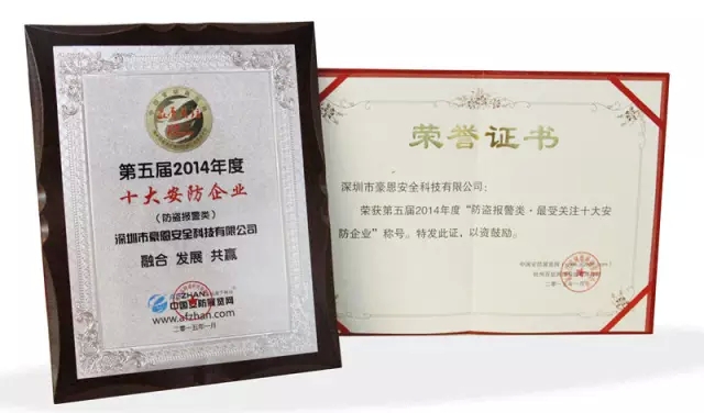 2015年3月16日,由中國安防展覽網(wǎng)主辦,備受業(yè)界關(guān)注的“第五屆2014年度最受關(guān)注十大安防企業(yè)頒獎盛典暨2015年安防新技術(shù)創(chuàng)新及成果研討會”在杭州召開,豪恩安防獲得“最受關(guān)注防盜報警類十大安防企業(yè)”榮譽稱號。